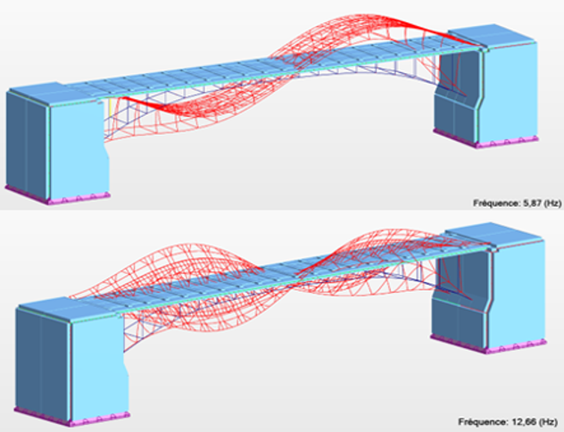 La comparaison de ces mesures terrain avec notre modélisation numérique (éléments finis) a révélé un écart majeur: l’existence d’un mode de vibration basse fréquence (4,64 Hz) correspondant à une translation longitudinale pure du tablier.