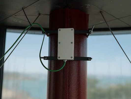 Inclinomètre connecté fixé sur le mur d’enceinte, instrumentation visible depuis la toiture